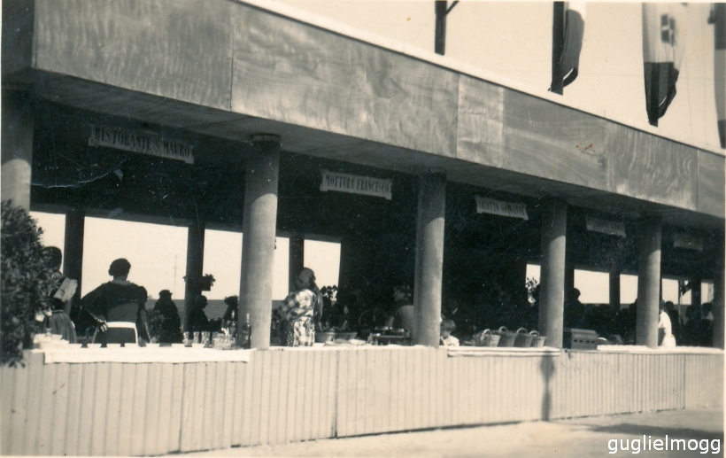 Una vista degli espositori tra cui si leggono: RISTORANTE S. MAURO, MOTTURA FRANCESCO (e di spalle con il vestito a quadri la nonna di Enrico), ARLOTTO GIOVANNI.