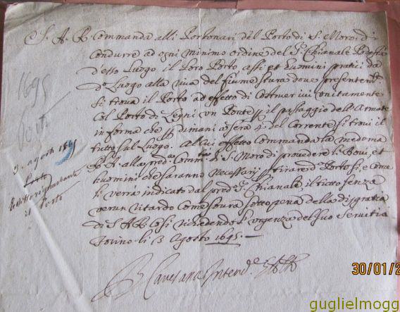 – Editto/Ordine 3 Agosto 1695 riguardante la concessione del porto e degli uomini necessari per trasportarlo in riva del fiume Stura per il passaggio del Armata
