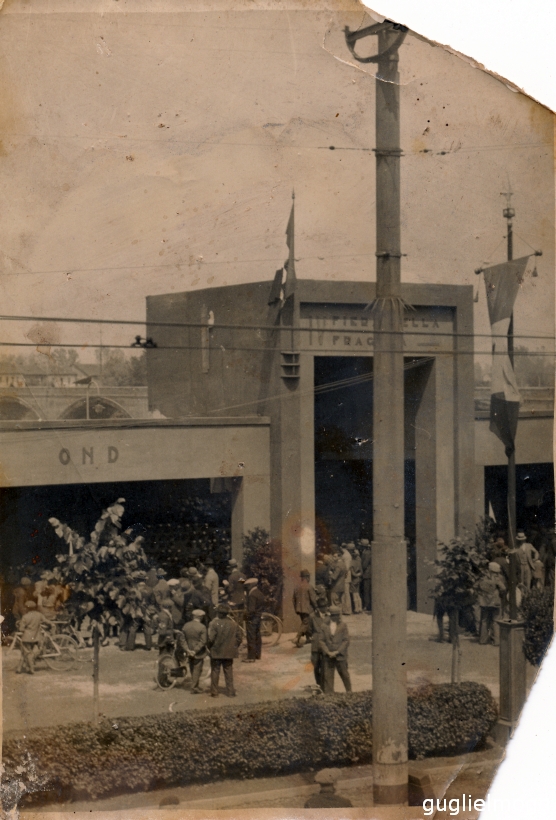 IV FIERA DELLA FRAGOLA: l’ingresso al padiglione, la folla dei numerosi visitatori in bicicletta, anche provenienti da Torino, all’ingresso della fiera ed al padiglione OND, Opera Nazionale Dopolavoro. Sopra la scritta, nello sfondo si possono vedere alcune arcate del Nuovo Ponte (aveva vent’anni circa).